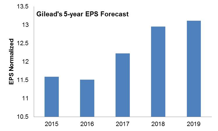 Perhaps as a direct response to its slow top-line growth, Gilead's management decided to ramp up its share buyback program by $15 billion last February, giving the company around $18 billion to spend on buybacks over the next five years. These share buybacks should help Gilead's bottom line post a CAGR of 2.51% for the next five years: