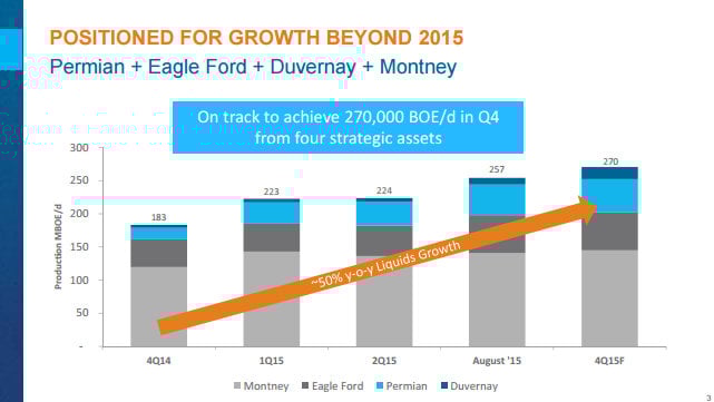 Encana has really made a lot of progress to reposition its business over the past couple of years. It has gone from an unfocused natural gas producer to a focused liquids growth company. It did so by jettisoning much of is disparate natural gas assets to focus the bulk of its attention on four core liquids-rich assets, which are now expected to drive 50% year-over-year growth in the company's liquids production.