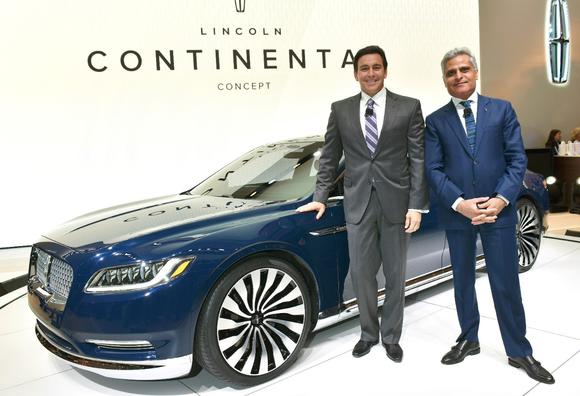 Ford CEO Mark Fields and Lincoln chief Kumar Galhotra with the Lincoln Continental Concept in New York in April. Ford will show off a production version of the Continental in January, according to reports. Image source: Ford Motor Company