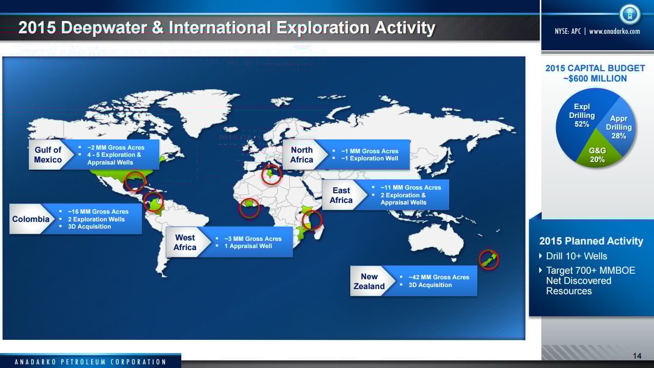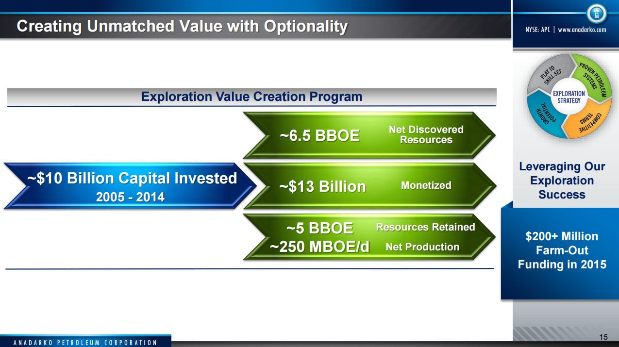 On this slide, we can see that it spent $10 billion on exploration over the past nine years, and it turned that investment into $13 billion in cash plus more than 5 billion BOE in retained resources. That retained resources base is not only driving a lot of current cash flow via production, but it will drive cash flow for years to come by being produced or further monetized. Given the tremendous value it has created, for Anadarko to now cut deeply into its exploration program would be akin to cutting off the lifeblood of its biggest value creator.