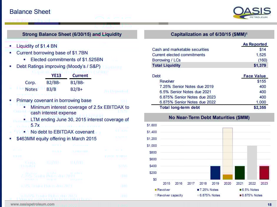 That's something that we find at Oasis Petroleum as well; in fact, the company is actually generating a little bit of free cash flow at the moment. During the second quarter it generated $36 million in free cash flow and it projects to be free cash flow positive in the second half of this year and in 2016 even in the current oil price range. Because of this, the available capacity on its borrowing base is really only a security blanket at the moment given that it doesn't need that liquidity to fund its business.