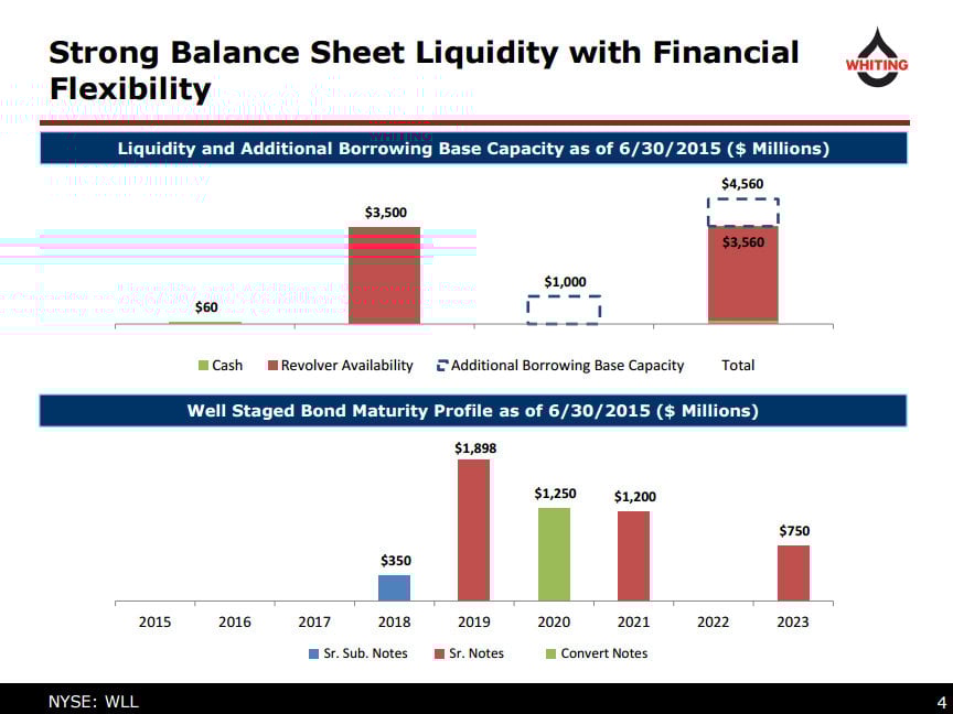 One company that had been bracing itself for a big cut was Oasis' Bakken Shale rival Whiting Petroleum (WLL +0.00%). It's CEO James Volker said that the company expected that its credit line would be reduced from $4.5 billion to $3.75 billion during the fall determination of its borrowing base. Having said that, it is worth noting that like Oasis Petroleum, not all of Whiting's borrowing base was currently available. We see this noted on the following slide, which shows that $1 billion of its total capacity is noted as additional borrowing base capacity.