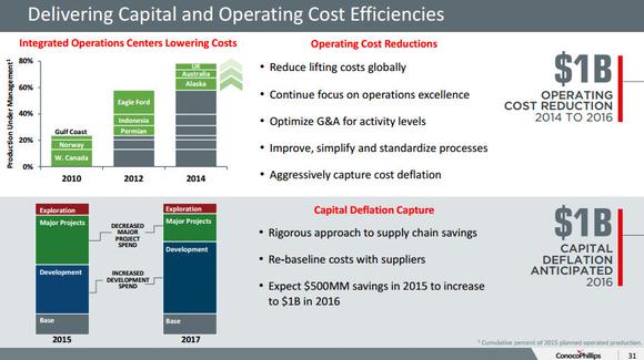 With the price of oil at about half of its prior peak, ConocoPhillips has focused on reducing its costs. We can see this in the following slide, which shows how the company is working toward reducing its operating costs by $1 billion while capturing $1 billion in capital cost deflation by the end of next year.
