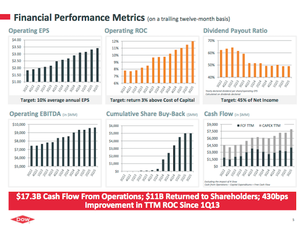Despite huge headwinds like a strong dollar and a generally weak global economy, Dow continues to show solid financial improvement. The slide below shows the company's earnings and margin growth along with the billions spent on share buybacks.