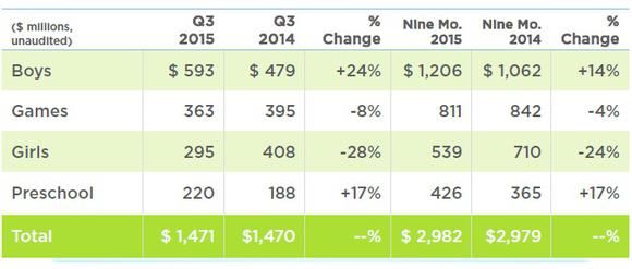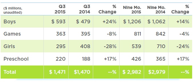 CEO Brian Goldner said on the conference call that toy sales were tracking at the high end of the company's expectations. Goldner also offered that the domestic/international percentage split of these toy sales was about 50-50. These toy sales should put some force in Hasbro's financial results for some time. Goldner reiterated that the company continues to forecast that the total revenue generated from the Star Wars franchise should be somewhat equally split between 2015 and 2016.