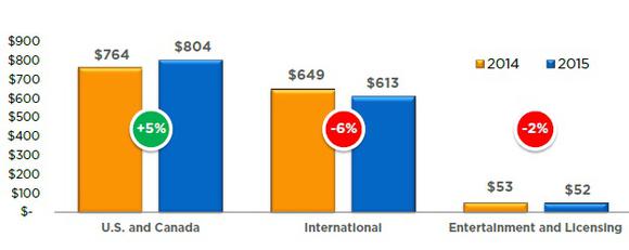 Excluding currency effects, revenue from the U.S. and Canada segment increased 6% during the quarter, while revenue from the international segment jumped 14%. The entertainment and licensing segment's revenue slipped 2%, primarily due to tough comps: Transformers: Age of Extinction revenue boosted the year-ago period's numbers.