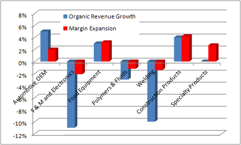 Delving into the details, the revenue decline is symptomatic of the weakness the company is seeing in some of its more cyclical end markets like welding and electronics. As you can see in the chart below, the organic revenue declines in test and measurement as well as electronics, polymers, and fluid, and welding are being accompanied by margin declines in these product lines.