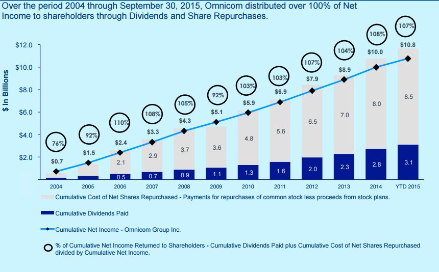 - So far in 2015, Omnicom has returned 108% of net income to shareholders through dividends and repurchases, maintaining a long-standing streak:
