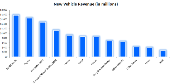That's a snapshot of how much revenue certain types of dealerships generated for AutoNation last year. Brands under the Fiat Chrysler Automobiles umbrella ranked eighth on that graph, but AutoNation took a step in the right direction and capitalized on very hot-selling FCA brands through its recent acquisition: six Chrysler-Dodge-Jeep-Ram stores were purchased within the 13-store Carl Gregory acquisition. That would boost the number of AutoNation dealerships selling FCA products by roughly 25% from the end of 2014 levels. This is important because the third-largest "Detroit" automaker has steadily increased its share of the U.S. market, and September marked the 66th consecutive month of year-over-year sales gains for FCA -- a very impressive statistic.