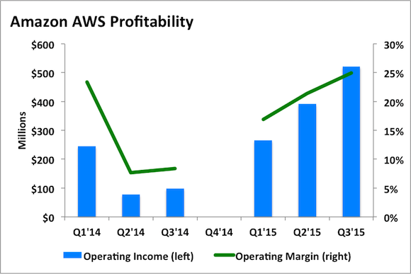 Better yet, AWS is now beginning to scale meaningful in terms of operating leverage, even with all of its aggressive pricing moves. Amazon only recently began disclosing concrete around its AWS business, much to the gratitude of investors. There isn't data available quite yet on Q4 2014, but other than that quarter here's all of the profitability data that Amazon has shared to date.