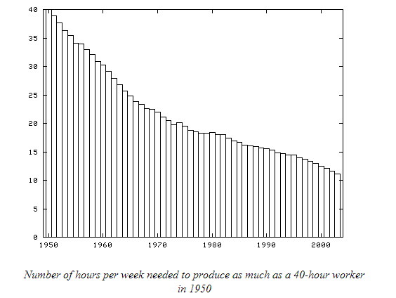 My colleague Morgan Housel has published the following chart before. It shows the number of hours an American worker would have to work today to produce as much as in 1950: