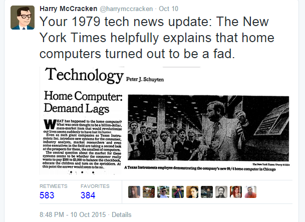 Although that bit of forecasting stupidity isn't nearly as egregious as Newsweek's "Why the Web Won't Be Nirvana," published in 1995. After AOL had already made shareholders a fortune. After Netscape was founded. (Newsweek then was one of the two major newsweeklies in the U.S., but its fortunes since have been dramatically altered by you-know-what.)