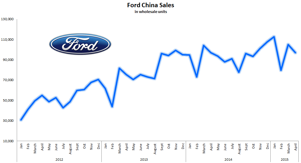 Chart by author. Information ends in April due to switch from reporting sales in wholesale units to retail units. Data source: Ford China's press releases.