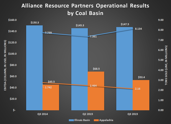Alliance Resource Partners is set up as a master limited partnership, so looking at earnings per share or net income results seem a bit silly. So instead let's look at the company's EBITDA. Two metrics that are arguably a better gauge of how a master limited partnership performs. EBITDA for the third quarter came in at $185 million, a slight decline from last years figure of $197 million and slightly below consensus analyst estimates compiled by S&P Capital IQ of $200 million. Here's how the company's operations breaks down by the two coal basins it operates: