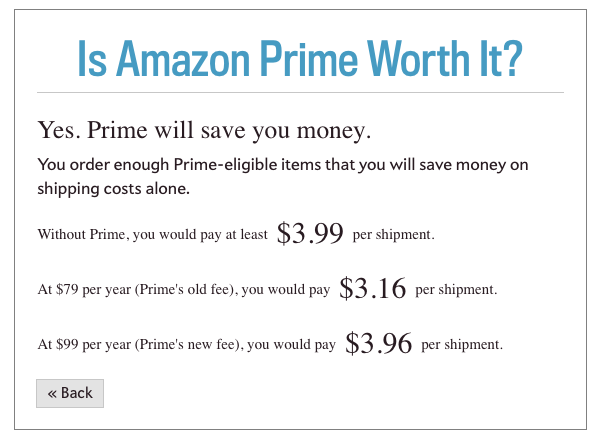 But for many people it won't be that obvious. If you order 12-13 packages a year and watch a little video and use some music on Prime, then it's probably worth it to you. It really comes down to Amazon offering shipping, plus two services that should/could cost $100-120 a year on their own.