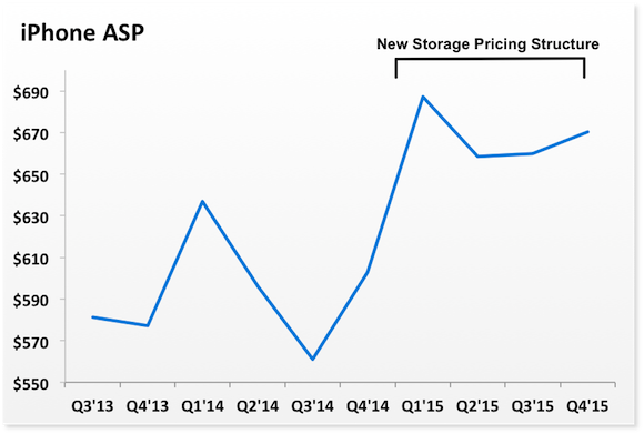 The iPhone performed well, with unit sales inching higher modestly on a sequential basis. The iPhone 6s and 6s Plus launched with just two days left in the quarter. Average selling prices rose to $670, the highest they've been in years thanks to an improving product mix. Which is also another way of saying that the whole new upsell pricing structure is working swimmingly.