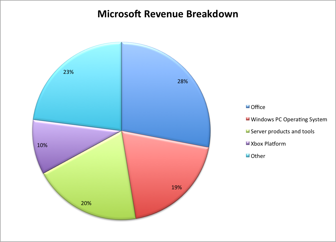 Despite its recent execution, Microsoft remains a company driven by two famously profitable, but aging, software products. Per the company's 2014 10-K filing, here's how Microsoft revenue breaks down along product lines: