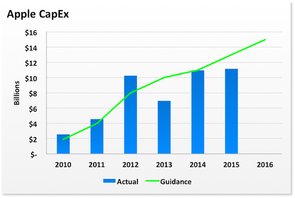 For some added perspective, here's how Apple's actual capital expenditures have been over the past few years compared to its guidance.
