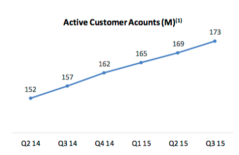 PayPal has consistently added around three million to five million new active customer accounts every three months, and the third quarter managed to match this trend. The company increased active user accounts to 173 million, an improvement of 10% year over year.