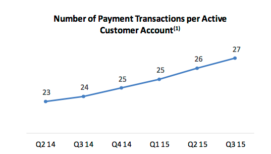 But customer growth isn't just improving -- those customers are also making more transactions and spending more with PayPal. Transactions per account hit 27, up from 26 in the second quarter. This marks three straight periods of increasing transactions per account.