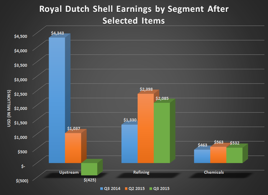 Even if we take out the effects of all those assets writedowns and impairments, results still weren't too impressive. Upstream earnings were dragged into the red mostly on its Americas segment, which lost $1.2 billion this quarter. But like many of its peers, Shell's refining and chemical segments helped bail it out from a completely disastrous quarter, as seen in the following chart: