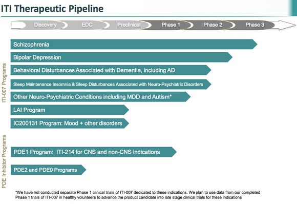 Better yet, because ITI-007 appears to work on the central nervous system, the company believes that it could be a potential treatment for a huge range of diseases. Take a look at the number of diseases that the company believes this product might be able to help treat.