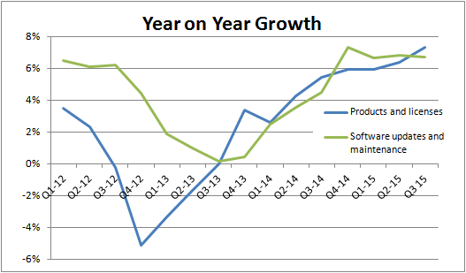 All of this means that growing product and license revenue is the key to future growth, and as you can see below, the growth rate increased to 7.2% in the quarter. This bodes well for future software and maintenance growth.
