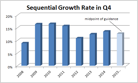 To put the revenue guidance into context, here is a graph of sequential (in this case, from the third to fourth quarters) growth rates for Check Point. As you can see, the midpoint of revenue guidance is for 12.7% sequential growth -- slightly below the average of 13.5% in the previous seven years.