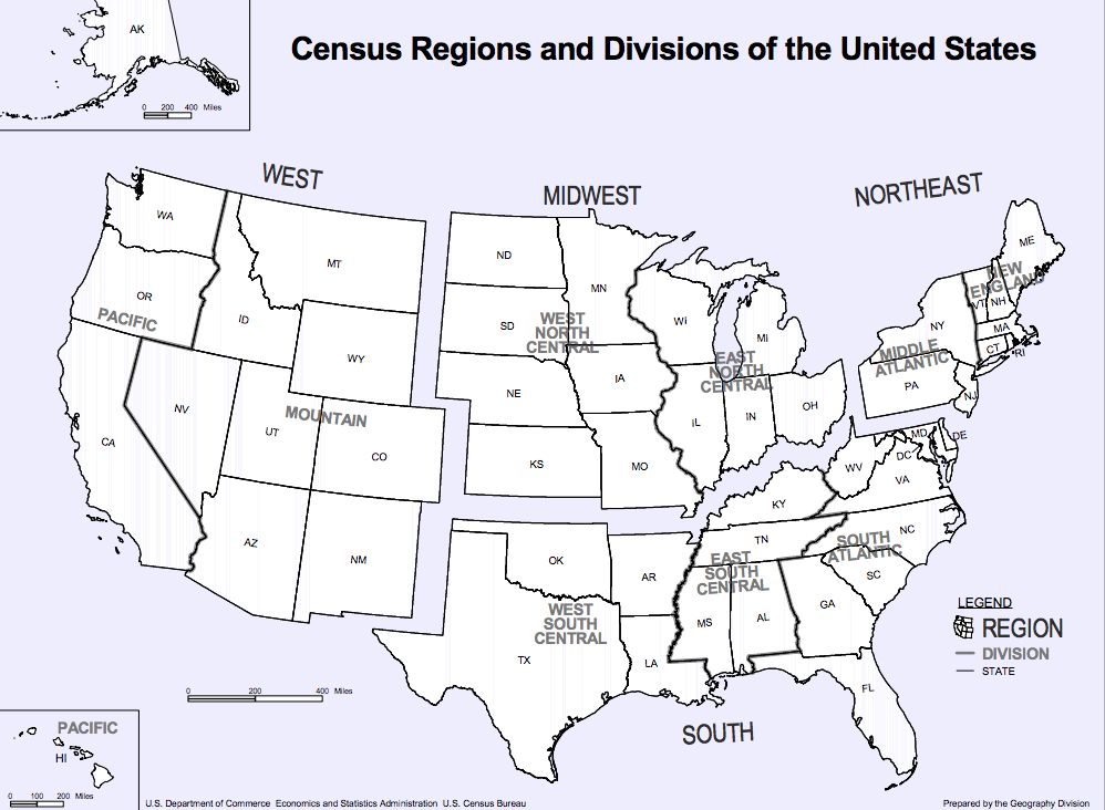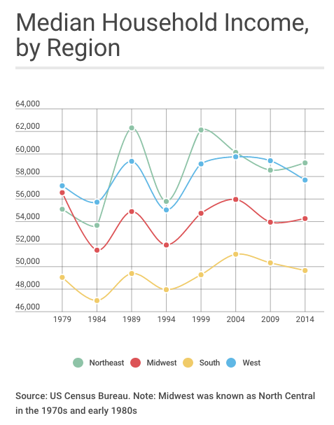The Census Bureau provides some clarity on the problem. Every year, the organization releases information on household income by region. It has divided the country into four sections: Northeast, Midwest, West, and South.