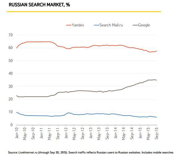 - However, Yandex also reversed its downward trend during the quarter, improving its share of Russian search by 70 basis points from June to 57.3% in September