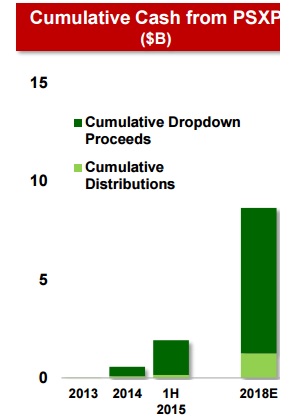 Phillips 66 is aggressively diversifying into more stable businesses such as its MLP, Phillips 66 Partners. The refiner, which acts as sponsor, general partner, and manager of the MLP, gradually sells its midstream assets to this entity under long-term secure contracts. This ensures predictable, commodity-insensitive cash flows that allow for fast distribution growth. As the following image shows, Phillips 66 plans to drop down billions of dollars in midstream assets to its Phillips 66 Partners over the next few years. Management believes these dropdowns will help achieve its goal of 30% distribution growth through 2018.