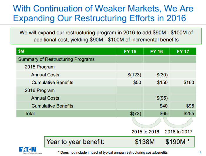 So that's not a great backdrop. Which is why Eaton announced that it was increasing its restructuring plans for next year by around $40 million. That will push the planned spending from around $50 to $60 million to $90 to $100 million. Eaton is basically looking to pull out costs to better align its businesses with the current state of the market.