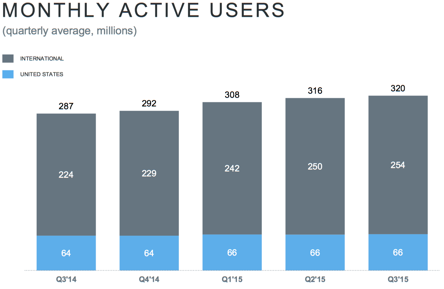 The company's less than 1% sequential user growth of monthly active users when excluding its SMS Fast Followers prompted more concern about the company's user growth when it reported third-quarter results. Even Facebook (FB +0.22%), with its 1.5 billion monthly active users, compared with Twitter's 320 million, is growing faster. During Facebook's second quarter, the company's monthly active users grew by 3% sequentially -- handily trumping Twitter's user growth ex-SMS Fast Followers and even more than doubling Twitter's sequential monthly active user growth when including SMS Fast Followers.