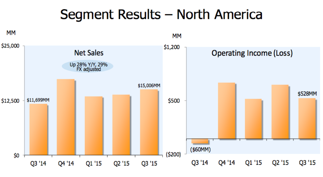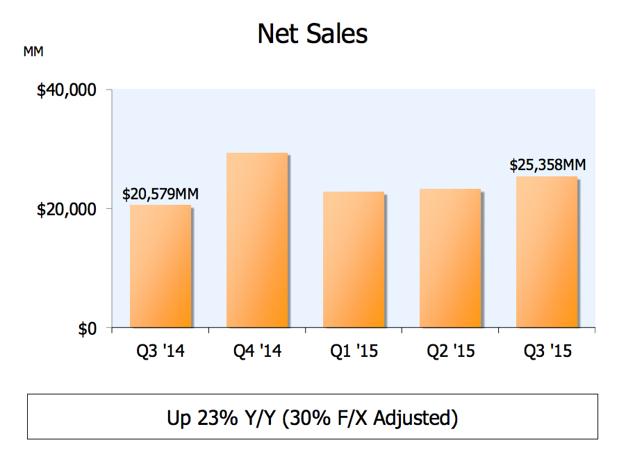 Amazon reported $25.4 billion in total sales during the third quarter of 2015, a big 23% year-over-year increase. Excluding the $1.3 billion negative impact from currency fluctuations, total sales grew by a staggering 30%. This kind of performance is quite outstanding for a company as big as Amazon, even in the rapidly growing e-commerce industry.