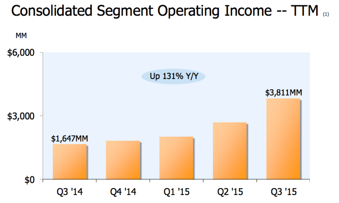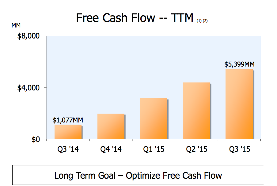Operating cash flow during the year ended in September grew 98% $9.8 billion. The company produced almost $5.4 billion in free cash flows during the 12-month period ended in September, an explosive increase versus $1.1 billion in the same period last year.