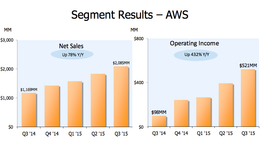 Amazon's cloud computing segment is truly on fire, producing a jaw-dropping 78% increase during the third quarter to $2.1 billion. Operating income in this division grew 432%, and the business is producing massive profitability, with operating margins in the neighborhood of 25% of revenue.