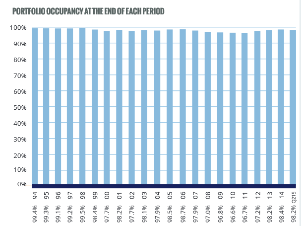 In short, these are all businesses that people have to physically go to. Because of this, there is minimal threat from online competition and minimal turnover since these businesses are reliant on their physical locations -- after all, how often does a fast food restaurant just pack up and move to a different location? This is the primary reason why Realty Income has maintained an excellent occupancy level, which has never fallen below 96% no matter what the economy is doing.