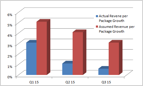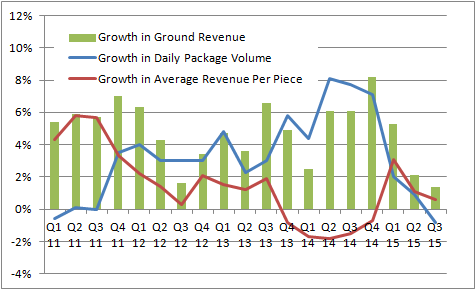 As you can see in the chart above, the third quarter saw a decline in ground volume for the first time since 2011. However, this would not be a concern if average revenue per piece was rising strongly -- that lower volume/higher price shift is exactly the kind of dynamic you might expect with dim weight pricing. The idea is that, ultimately, ground revenue should increase. Unfortunately, as the chart shows, after a nice pick up in the first-quarter, both pricing and revenue growth slowed in the last two quarters. Is this a sign of a problem?