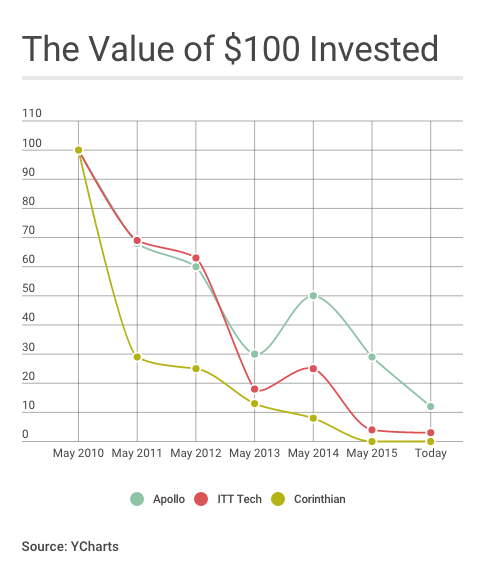 Instead, look at the steady deterioration you would have experienced if you invested $100 each in three of the largest for-profit educators at the time: Corinthian Colleges (NASDAQ: COCOQ), ITT Tech. (ESI +0.00%), and Apollo Education (NASDAQ: APOL) -- parent of the University of Phoenix.