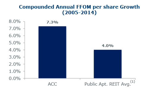 In addition, American Campus Communities has produced excellent growth, with net operating income (NOI) growth of 4.3% annualized and FFOM (adjusted FFO) growth averaging 7.3% per year. Both metrics are above the apartment REIT industry's averages.
