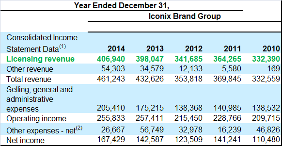 Licensing agreements allow the company to eliminate or substantially reduce inventory and operating risk associated with traditional retailers. While Iconix owns the licenses to the brands, the licensees are fully responsible for the cost of manufacturing and selling. The licensing business, as its main source of revenue, has been quite profitable over the years: