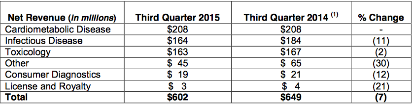 What: Shares of Alere (NYSE: ALR), a company focused on rapid diagnostic testing, were down more than 11% in early morning trading on much heavier than normal volume after the company reported its third-quarter earnings.