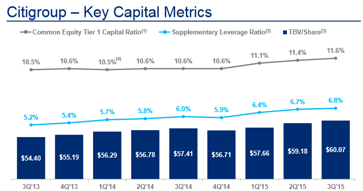 Citigroup has steadily become better capitalized, and the company's Common Equity Tier 1 Ratio has grown from 10.6% to 11.6% over the past year, continuing a multi-year trend.