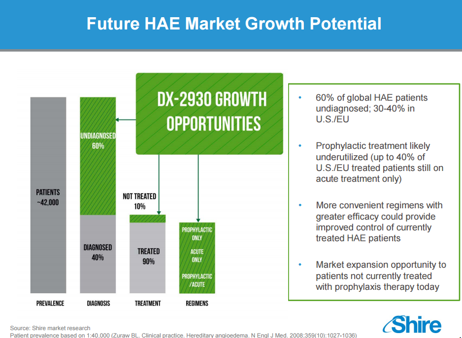 - Switch from solely acute therapy to DX-2930 for prophylaxis. Shire's management estimates that around 40% of currently diagnosed and treated patients are only taking drugs to treat attacks, instead of taking drugs to prevent those attacks. Since Shire is so involved in the HAE market already with Cinryze and and Firazyr, I suspect management's estimates are quite accurate. This is an opportunity not just for peak sales, but perhaps more excitingly for long-term sales. Prophylactic use means patients would be taking DX-2930 year in and year out, with strong dividends for patient quality of life and annuity-like returns for Shire.