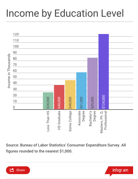 The difference between those who only complete high school and those who complete their bachelor's is striking: more than twice as much income.