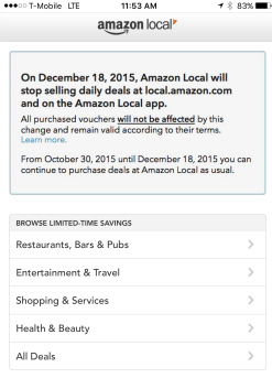That proved to be a short-lived venture as well. Amazon spoke to GeekWire about the suspension of its Local app, "We've learned a great deal from the daily deals business and will look for ways to apply these lessons in the future as we continue to innovate on behalf of our customers and merchants," a company spokesperson told the tech news site. Existing purchases will be honored, but starting Dec. 18, "you will no longer be able to reinstall or download the Amazon Local app if you switch devices or uninstall the app."