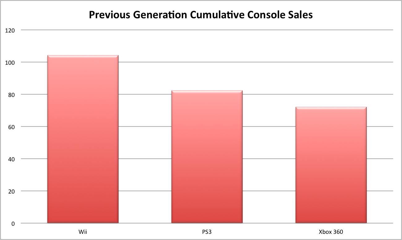 The last generation of the console wars included familiar combatants Microsoft, Sony, and Nintendo facing off with their respective consoles -- the Xbox 360, the PlayStation 3, and the original Wii. Although not perfectly overlapping, the three consoles competed over an 8-year period ranging from roughly 2005 to 2013. And thanks to data from GeekWire in mid-2013, we can get a pretty definitive sense that the last generation of the console wars was far less competitive than the first.