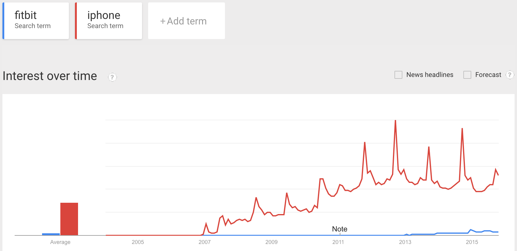 Thinking Fitbit could be my chance to buy into high-growth investment and make some big bucks, I followed the advice, "If you love the product, check out the stock". Low awareness of the products among people I know suggests I'm an early adopter. Google Trends confirmed that suspicion: For every 57 Google searches for "iPhone" in September, there were only three searches for "Fitbit".