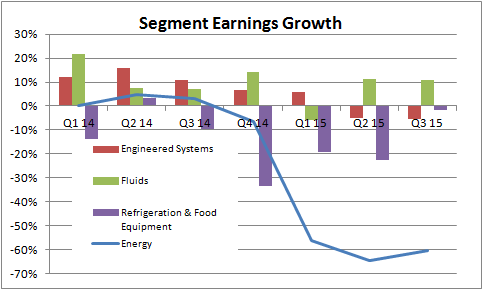 However, Dover's difficulties haven't arisen solely from weaker oil prices. As you can see in the chart below, only the fluids segment has consistently posted earnings increases in the last two quarters.