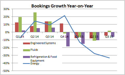 Another source of concern is the company's recent guidance regarding its strongest segment this year (in terms of earnings growth and bookings): fluids. The segment was responsible for 24% of the last four quarters' income, but in the recent third-quarter earnings call, CFO Brad Cerepak announced a downward revision to its full-year organic revenue forecast for the segment. "Fluids' growth rate has been reduced 3 points to 2% to 3%, driven principally by weak oil and gas markets," he said.